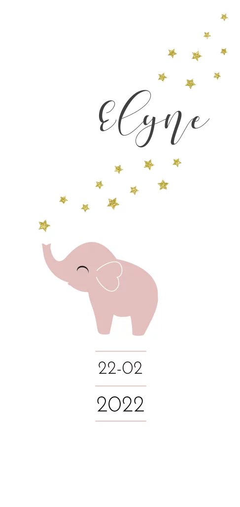 Een lief olifantje die gouden sterretjes blaast! Tussen de sterretjes is ruimte voor de naam van jullie kindje. Maak online een uniek geboortekaartje; pas kleuren en teksten aan en kies je favoriete lettertype.