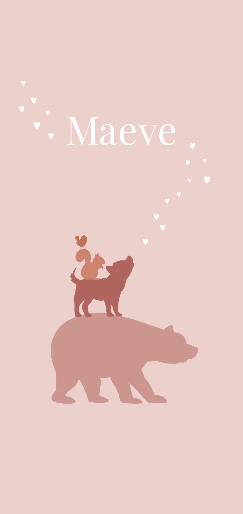 Geboortekaartje met folie voor een meisje. Op een licht oudroze achtergrond zie je boven elkaar een aantal bosdieren; een beer, een wolfje, een eekhoorn en een vogeltje. De naam en sprankelende hartjes in goudfolie maken het helemaal af!