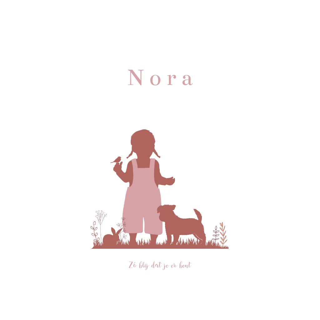 Wat een lief geboortekaartje met silhouet van een meisje met vlechtjes en schattig tuinpakje. Op haar handje zit een vogeltje en in het gras een konijntje en een puppy. Deze diertjes kun je eventueel ook vervangen door andere dieren uit de beeldbank. - Nora -