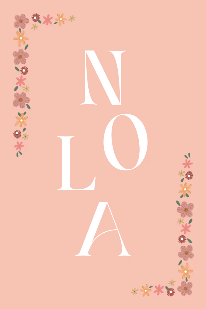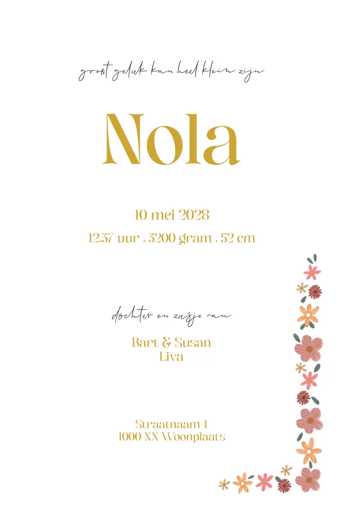 Hip geboortekaartje in bohemian stijl voor een meisje. De naam in goudfolie op speelse wijze geplaatst, omring door een kleurige bloemenrand. - Nola -