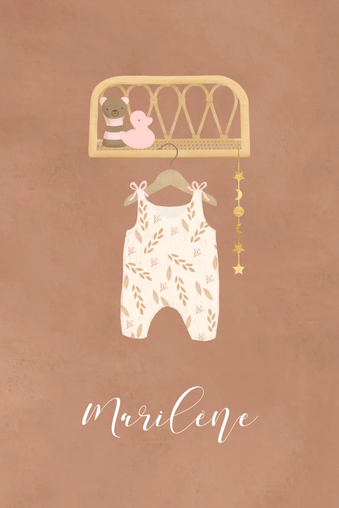 Hip geboortekaartje voor een meisje in trendy boho stijl! Op de mooie roestbruine achtergrond komt het rotan wandrekje en het babypakje met leuke print heel mooi uit! De goudkleurige slinger met sterretjes en maantjes komt misschien ook terug in jouw babykamer? De kleur van de achterzijde van het kaartje matched met de kleur van het babypakje en ook de takjes zijn uit het patroon van het pakje.