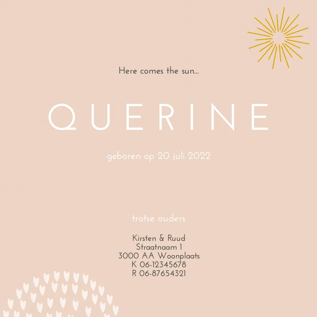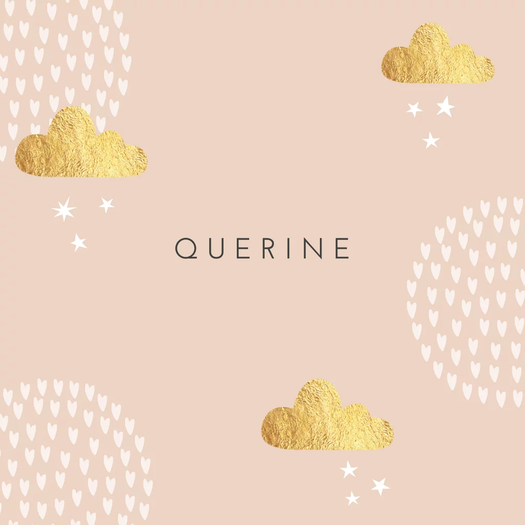 Hip geboortekaartje voor een meisje met "peach" achtergrond. Een ontwerp met goudkleurige wolkjes, cirkels met hartjes en sterretjes. Natuurlijk kun je alles naar wens aanpassen, zowel de achtergrond kleur als lettertypes. Of misschien wil jij andere beelden toevoegen uit onze beeldbank om er zo een heel persoonlijk kaartje van te maken!