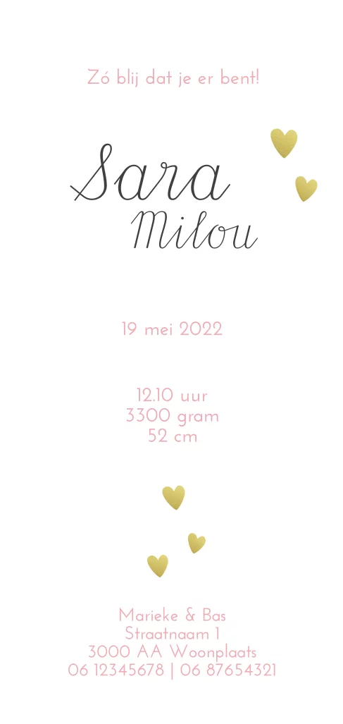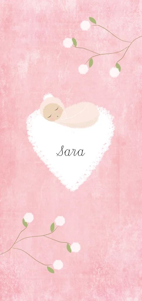 Lief meisjes geboortekaartje met roze achtergrond met geschuurd effect. Sierlijke takjes met pluizige bolletjes en een hartvormige wolk waar een kleine baby op ligt te slapen.