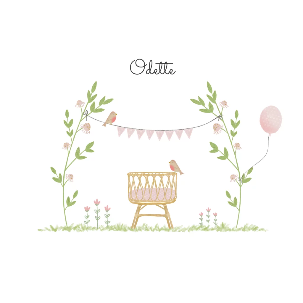 Lief geboortekaartje voor een meisje met handgetekende takjes, bloemetjes, roodborstjes en een schattig rotan wiegje.