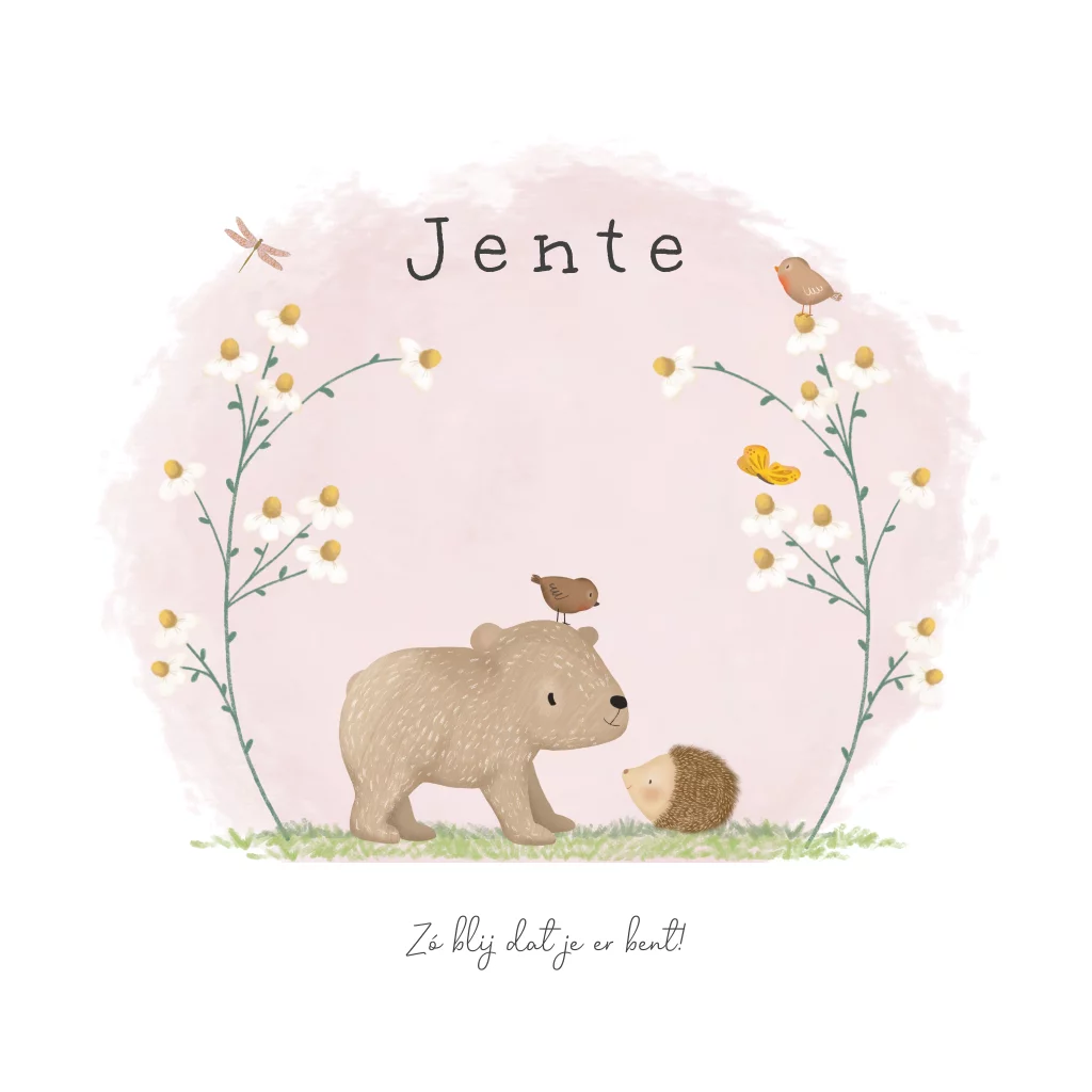 Superlief en vrolijk geboortekaartje voor een meisje met illustratie van een kleine beer en een egel en takjes met witte bloemetjes.