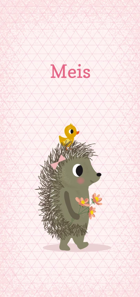Lief geboortekaartje voor een meisje met roze geruite achtergrond en egeltje met een eendje op haar kop. Op de achterzijde komt het eendje weer terug.