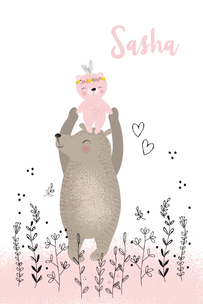 Lief geboortekaartje voor een meisje met grote bruine beer die kleine roze beer op zijn kop draagt. De kleine beer heeft een bloemenkrans en indianenveren op haar kopje. De twee zijn omringd door vrolijke blaadjes, takjes en hartjes.