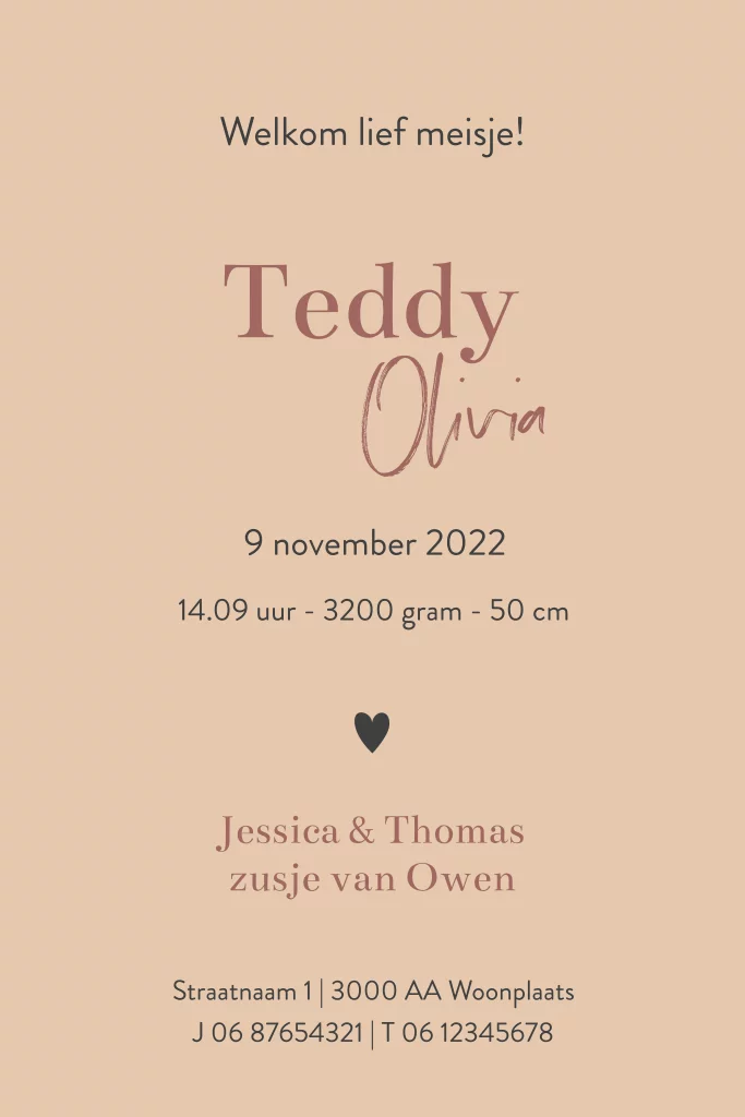 Lief geboortekaartje voor een zusje. Mooie camel kleurige achtergrond met daarop een silhouet van een grote broer. Hij heeft een sjaal om en een muts op en trekt een wagentje achter zich aan. Daarin zit zijn kleine zusje! Zij heeft ook een mutsje op en een sjaal om. Dit ontwerp is helemaal naar eigen wens aan te passen.