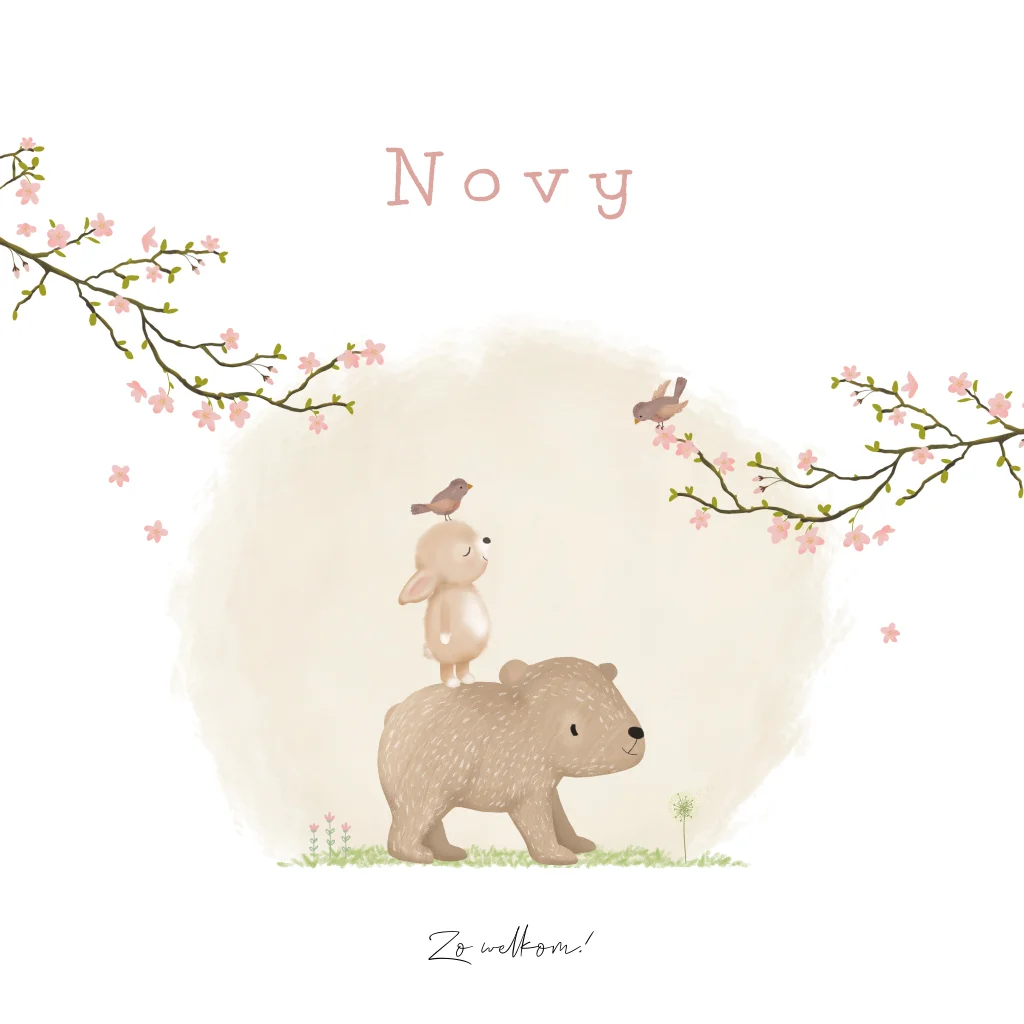 Lief lente geboortekaartje voor een meisje, met beertje en konijn omringd door bloesemtakjes en vogeltjes. - Novy -
