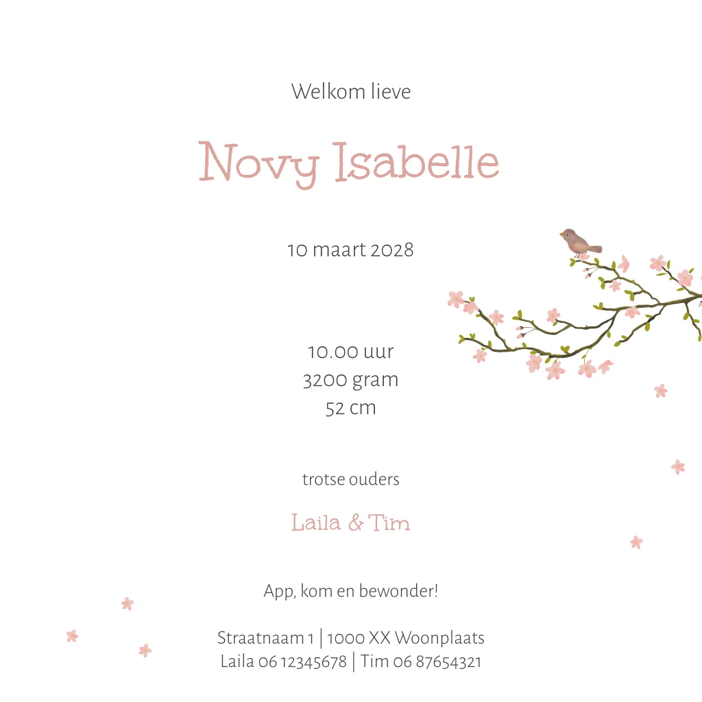 Lief lente geboortekaartje voor een meisje met bloesem