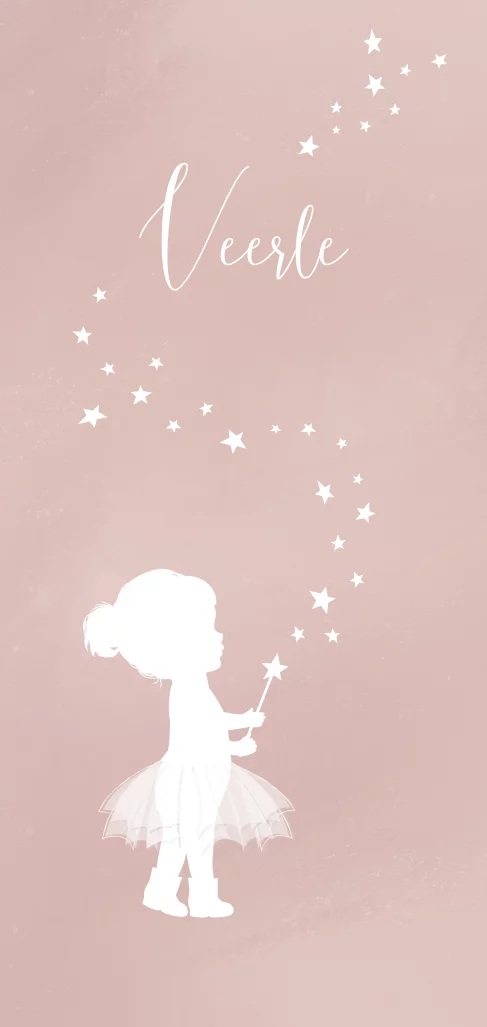 Lief geboortekaartje voor een meisje met oudroze achtergrond. Een silhouet van een meisje met een transparant rokje aan. Het meisje heeft een toverstafje in haar hand en uit het toverstafje komen sterretjes die vrolijk om de naam van jullie kindje sprankelen! Dit kaartje is helemaal naar eigen smaak aan te passen via de editor.