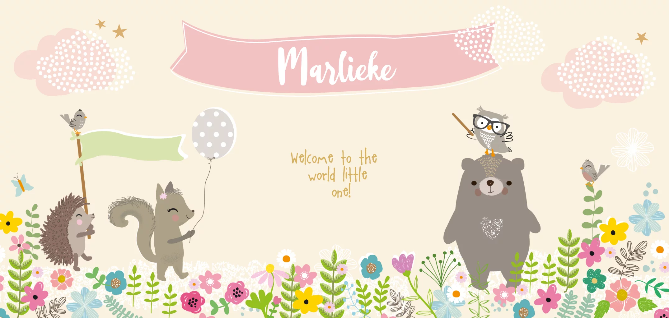 Lief meisjes geboortekaartje met een veld van bloemen, een egeltje, een eekhoorn met een ballon, een beer met een uiltje op zijn kop en vogeltjes. Een naambanier omringd door wolkjes en sterretjes. Wat een vrolijk tafereel!