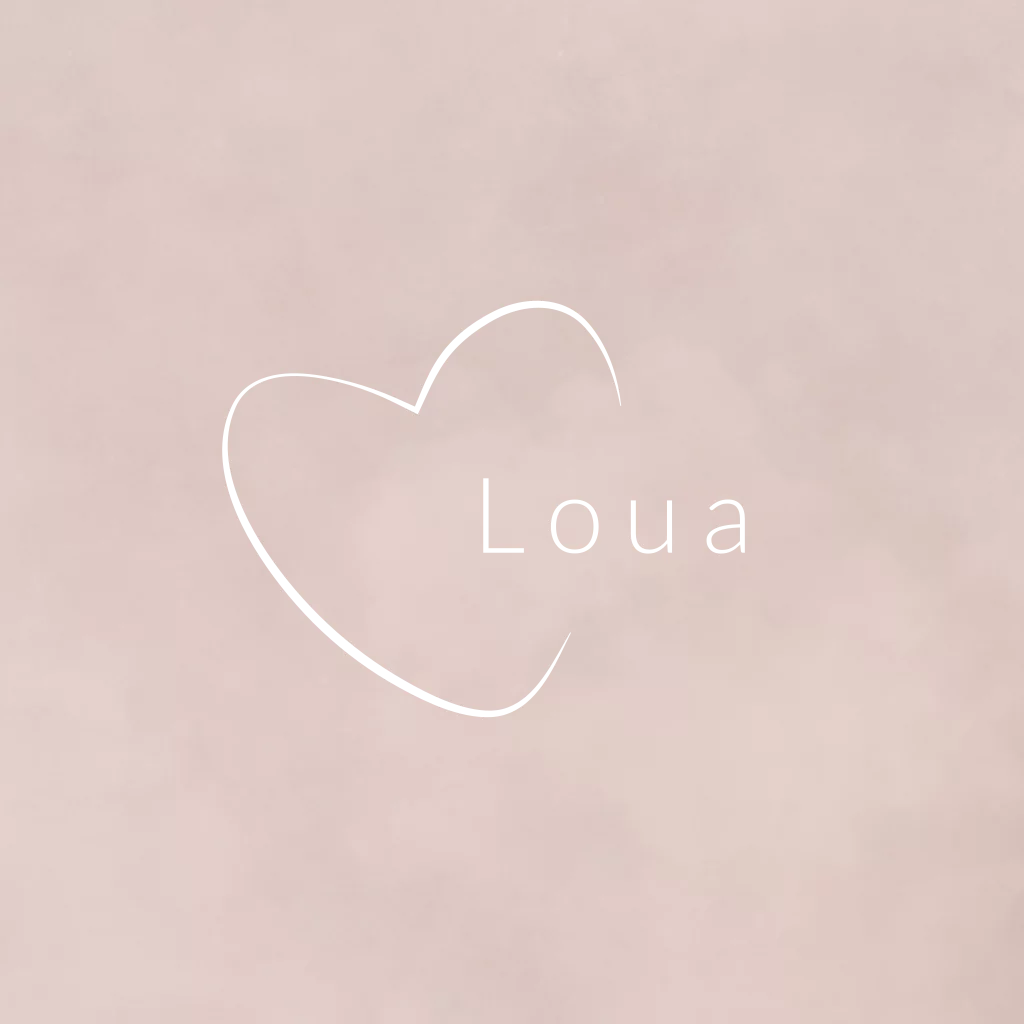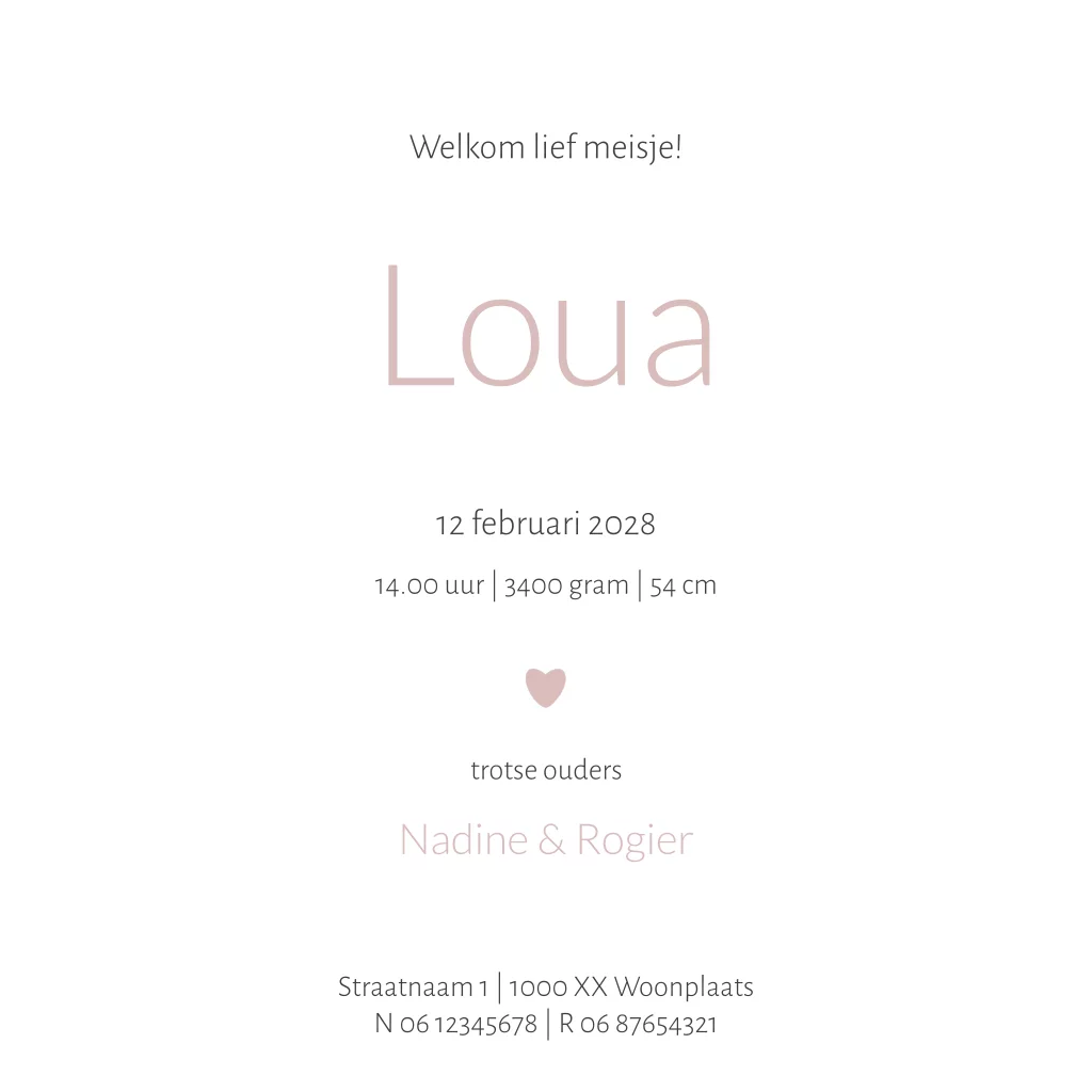 Minimalistisch geboortekaartje in mooie oudroze poedertinten. Deze kleur combineert prachtig met het hartje en de naam in goudfolie. - Loua -