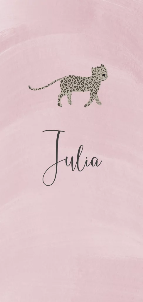 Een stoer geboortekaartje voor een stoer meisje! Mooie oudroze achtergrond met verfstructuur. De kleine panter komt hier mooi op uit en de naam van jullie kindje springt er helemaal uit!