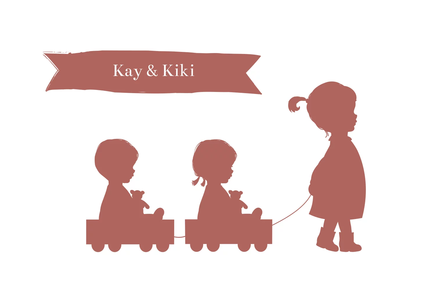 Origineel geboortekaartje voor een tweeling. Drie kindjes op een rij; de oudste loopt voorop en trekt twee karretjes voor met daarin haar zusje en broertje.