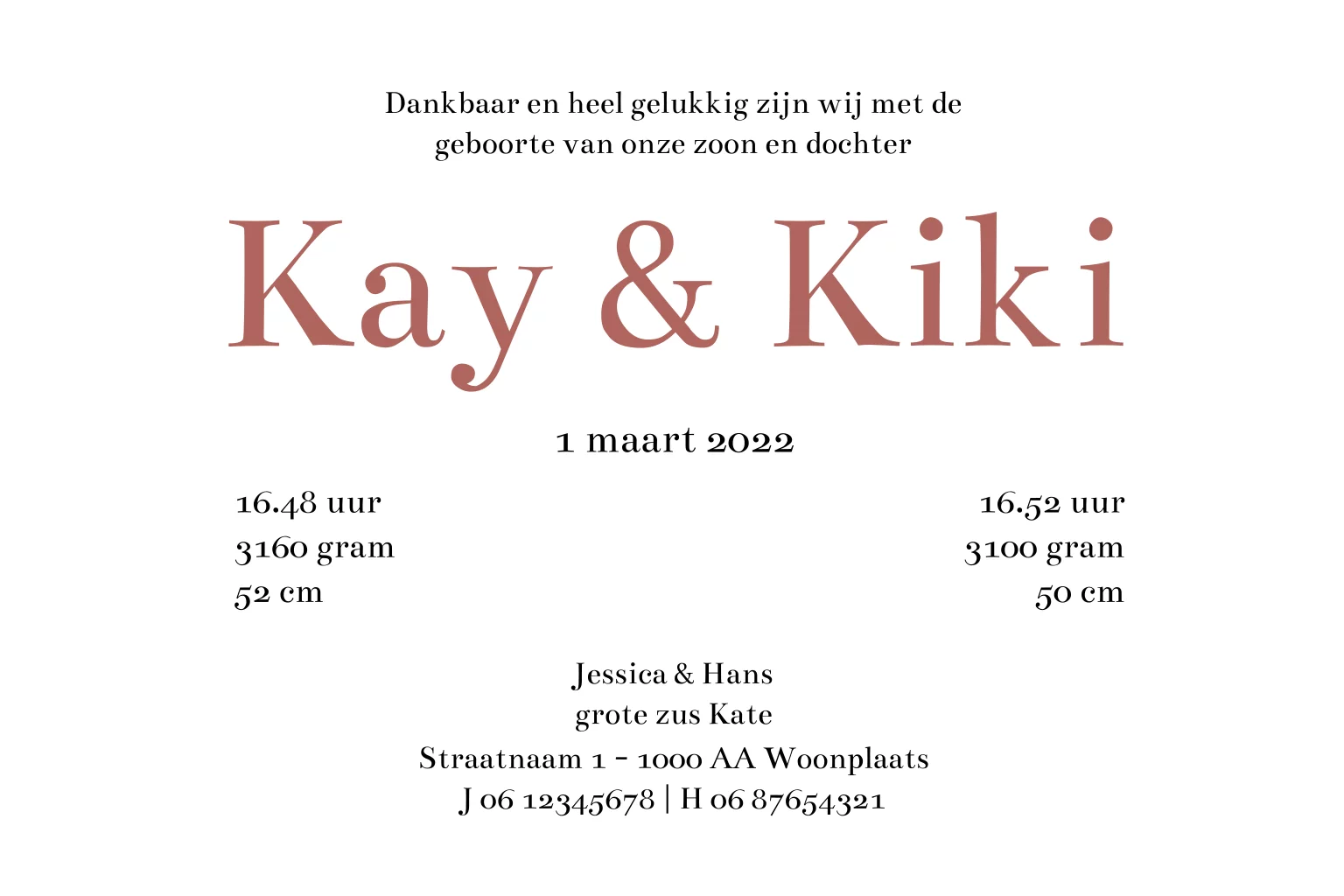 In de banner worden de namen van de tweeling vermeld. De samenstelling van de kindjes is eenvoudig aan te passen door andere beelden uit de beeldbank te kiezen. Ook de kleur en de lettertypes kun je zelf naar eigen smaak aanpassen.