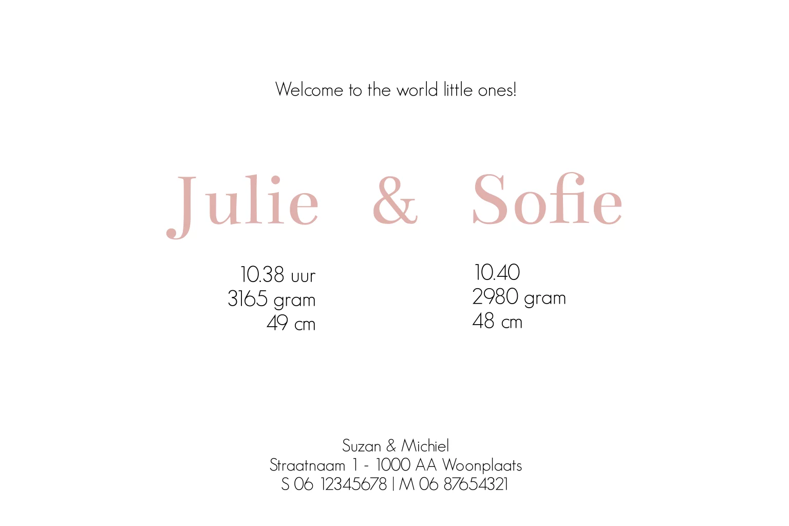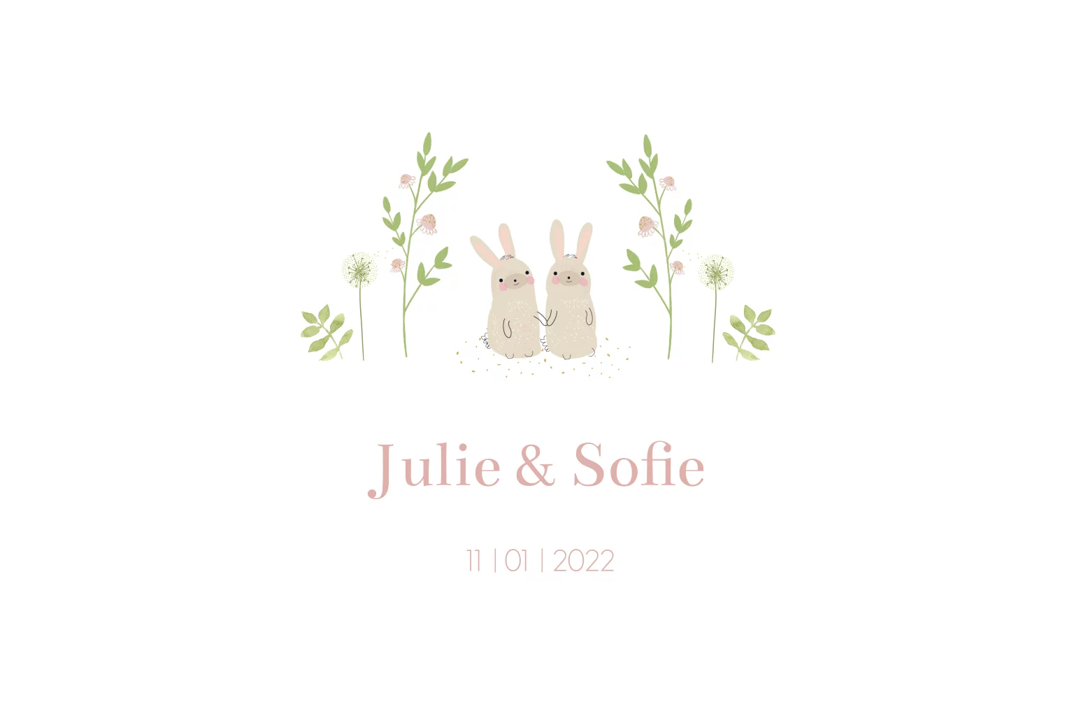 Een lief geboortekaartje voor een tweeling. Op de voorzijde een illustratie van konijntjes omringd door takjes en bloemetjes. Aan de binnenzijde komen een aantal van deze takjes terug.