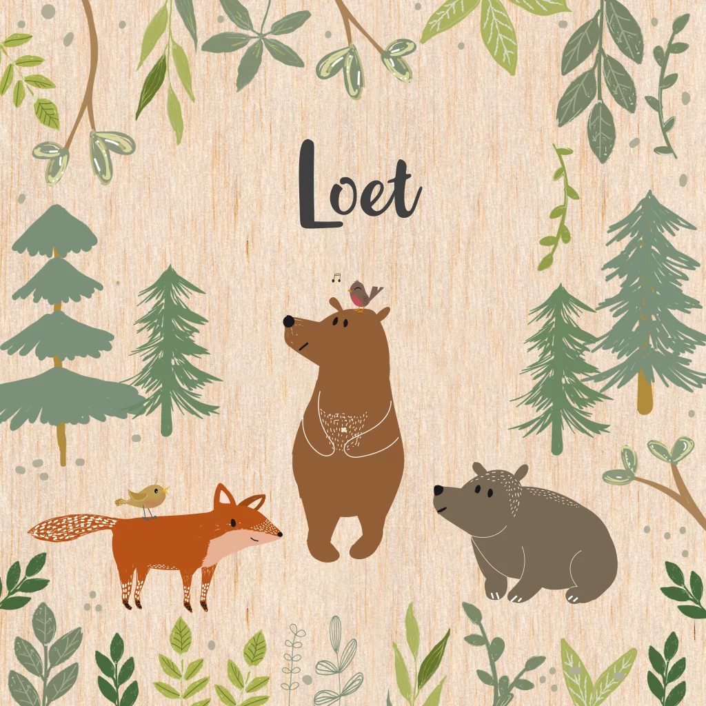 Geboortekaartje op echt hout. Dit tafereeltje met beren, een vosje vertelt eigenlijk een verhaaltje. De illustraties komen prachtig uit op de houten achtergrond.