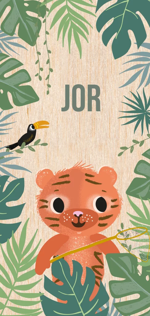 Origineel en stoer houten geboortekaartje voor een jongen met tijgertje in de jungle. Hij is omringd door tropische bladeren en heeft gezelschap van een kaketoe op een tak.