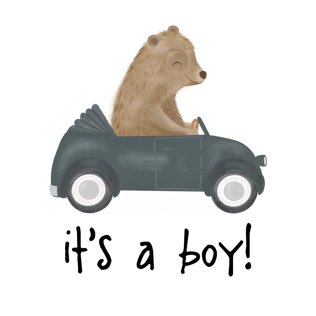 Vrolijke sluitzegel met illustratie van een beer rijdend in een autootje en de tekst "it's a boy!". Deze sluitzegel is naar wens aan te passen via de editor.