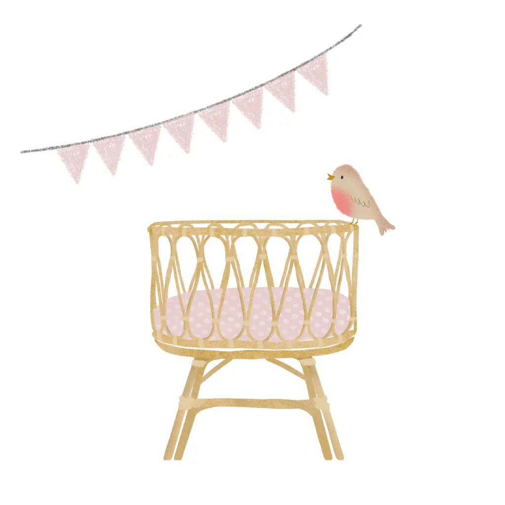 Sluitzegel met rotan wiegje, vrolijke slinger en een vogeltje.